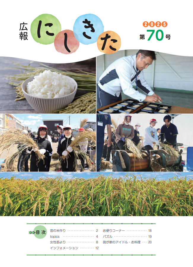 広報誌 広報誌「にしきた」2025年・第70号 2025.10.22 2025年 第70号 ・昔の米作り ・topics ・女性部より ・インフォメーション ・お便りコーナー ・パズル ・我が家のアイドル、お料理 つがる統括支店農協まつり「ふれあい感謝祭」のお知らせ