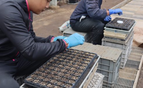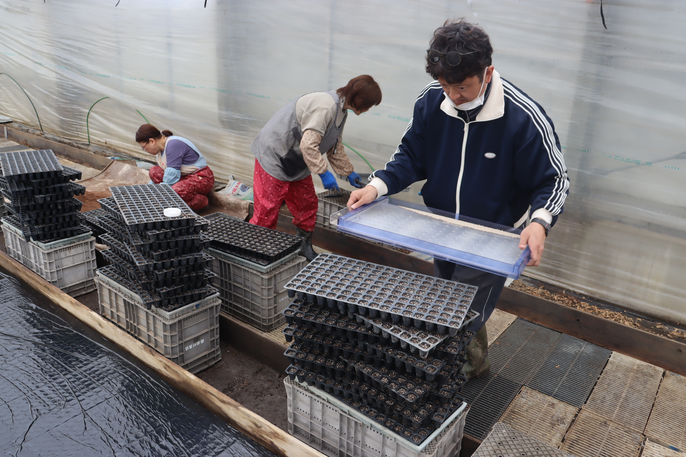 管内の育苗ハウスで、2月12日からブロッコリーの播種が始まりました。この日は、職員や作業員が播種機を使用して432枚分の種をまきました。作業前後は水分をたっぷり与え、播種後はハウス内の温度や苗の生育状態を細かく管理しています。苗は約50日間育てられた後、4月以降に生産者の畑へ定植されます。