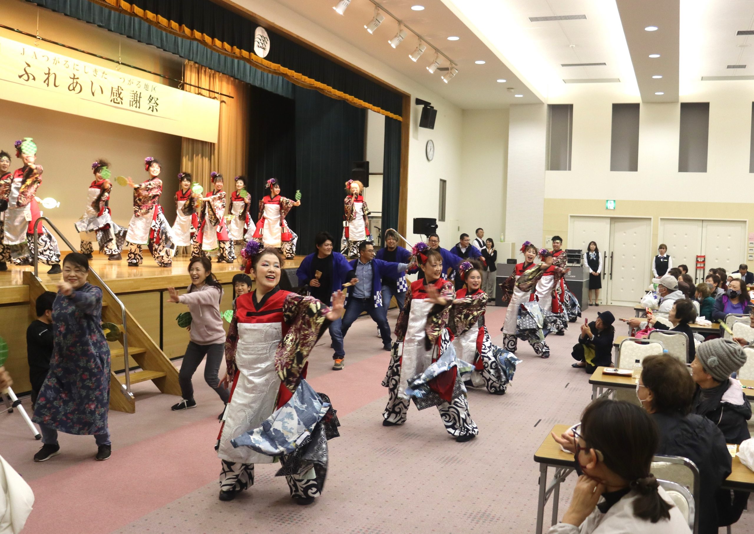 AOMORI花嵐桜組のよさこい演舞では、観客や職員が飛び入り参加し、会場が一体となって盛り上がりを見せました。