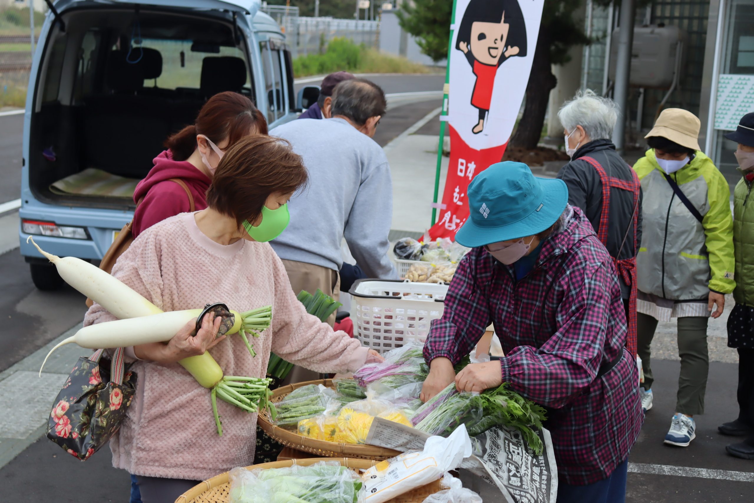 女性部つがる白神支部は10月12日、つがる白神統括支店前で「朝市」を開催しました。女性部員が育てた野菜や果物などがずらりと並び、買い物客で朝から賑わいを見せました。