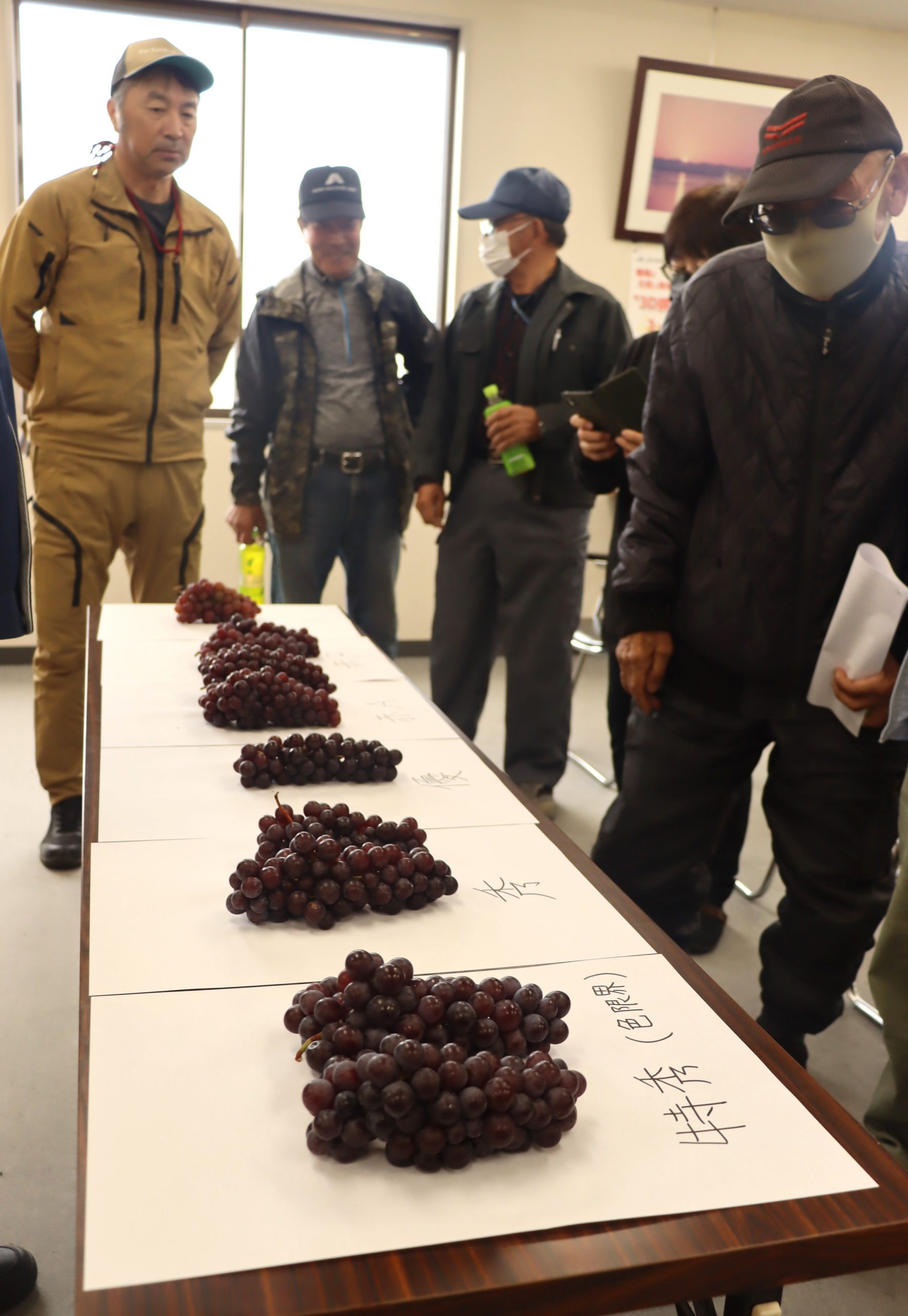 鶴翔ぶどう部会は10月20日、鶴翔統括支店で本年産のぶどう目揃え会を開き、販売対策や出荷規格について再確認しました。今年は6月中旬以降の天候が高温で推移したことで生育が進み、着色始めは平年より14日程早まりました。夏に降雨が少なかったことから今年は小粒傾向ですが、糖度はその分増し、おいしいスチューベンに仕上がっています。